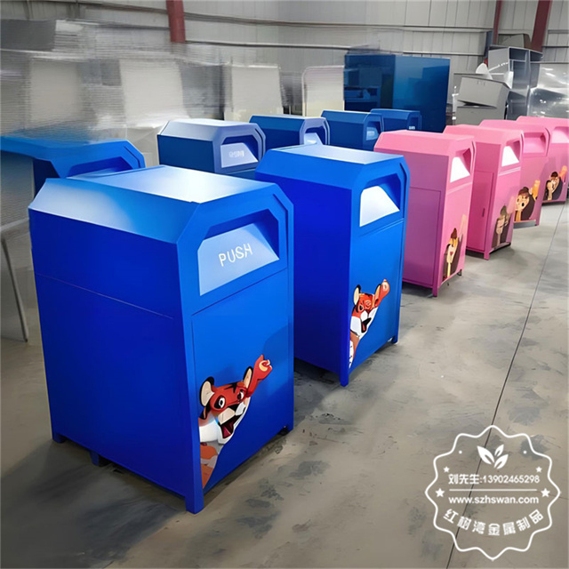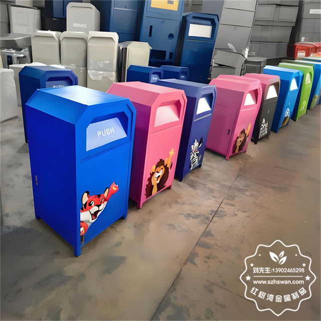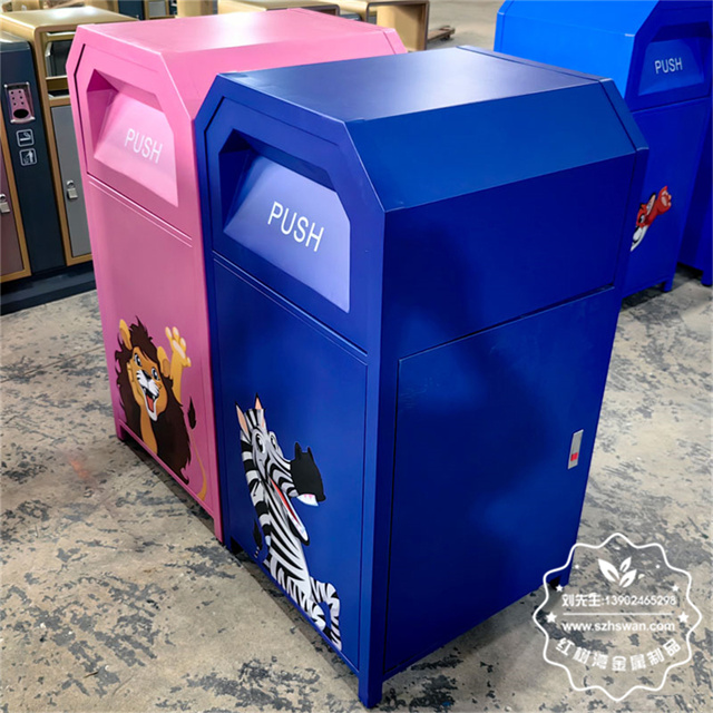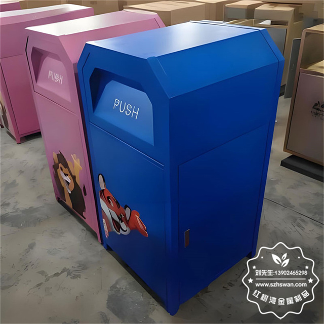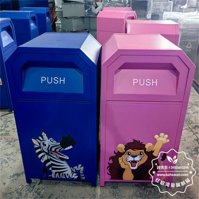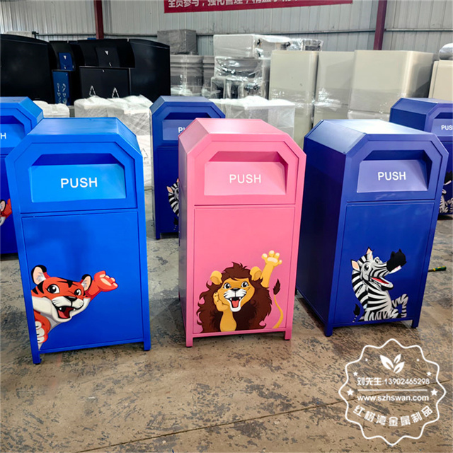 产品材质:公园幼儿园卡通UV打印不锈钢分类垃圾桶采用201#,202#,304#优质不锈钢材料模压成型,坚固耐用;内外表面光洁,减少垃圾残留,易于清洁;配置镀锌板内桶,便于垃圾清倒;