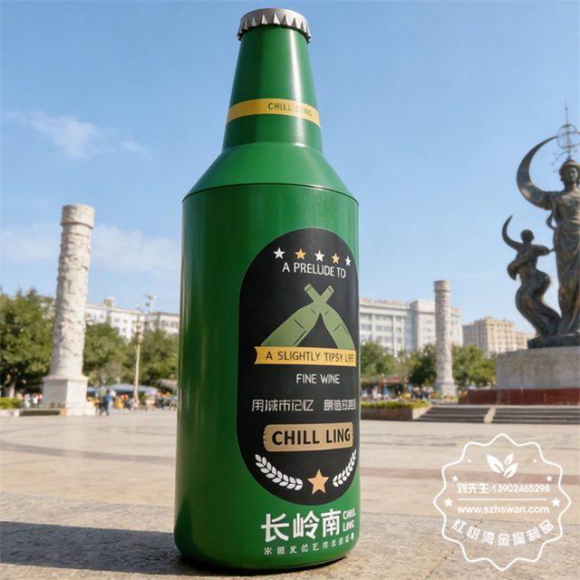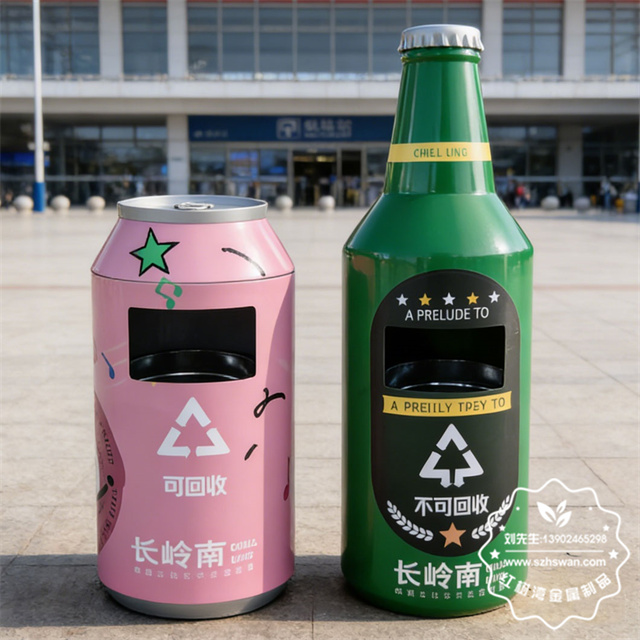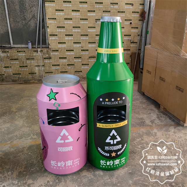 产品材质:户外啤酒瓶造型镀锌板铁皮垃圾桶采用优质冷轧钢经除油-除锈-表调-磷化处理后,表面采用汽车静电粉末经过180~220℃高温烤漆,使粉末熔化黏附在金属表面,双层防锈,漆面色泽耐久;