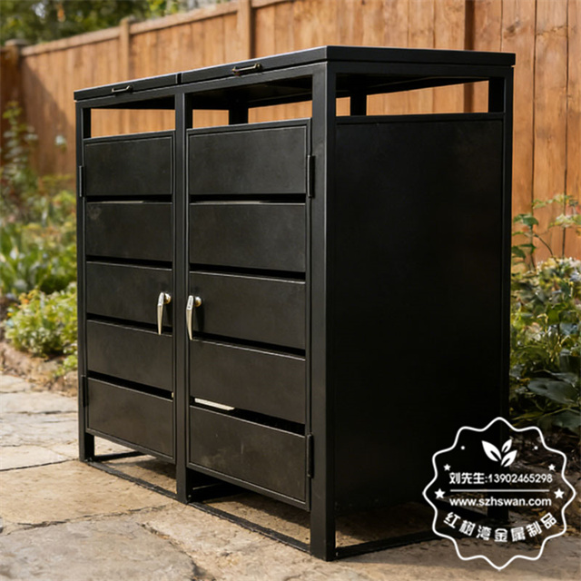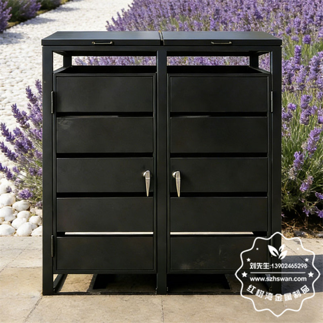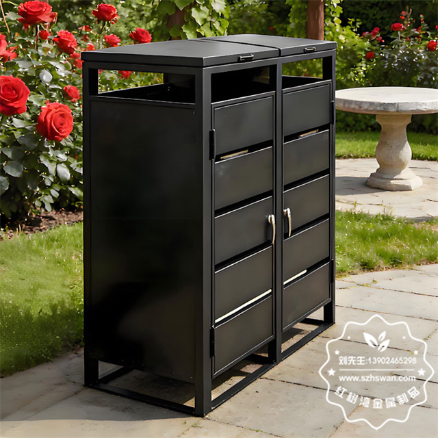 产品材质:户外花园240升镀锌板分类垃圾桶罩采用优质冷轧钢经除油-除锈-表调-磷化处理后,表面采用汽车静电粉末经过180~220℃高温烤漆,使粉末熔化黏附在金属表面,双层防锈,漆面色泽耐久;