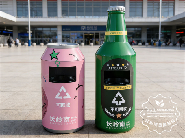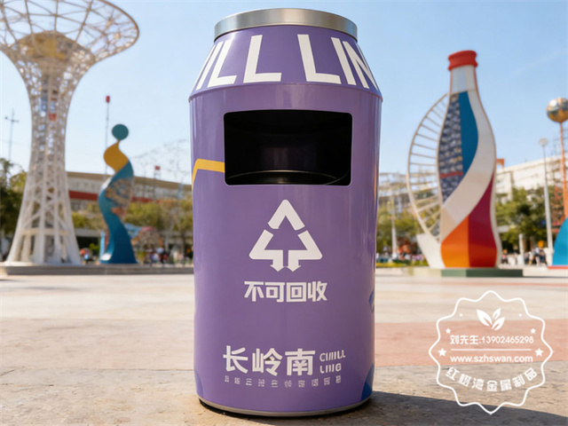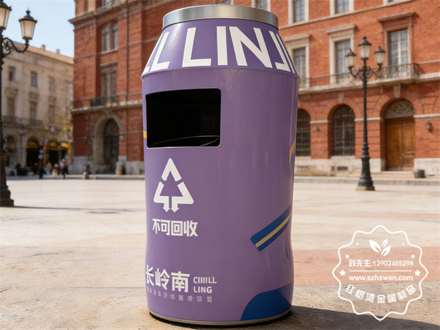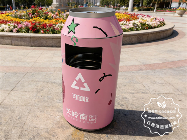 不同于一次性易拉罐的铝材,这些定制垃圾桶采用优质镀锌钢板制作。这种材料选择不仅确保了户外使用的耐候性和坚固度,更通过特殊的表面处理工艺,还原了易拉罐特有的金属质感与印刷效果。