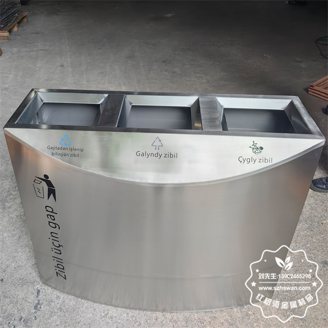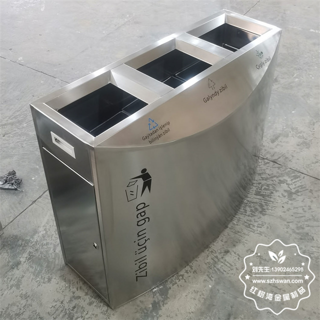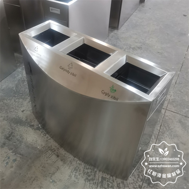 产品材质:室内商用三分类连体不锈钢垃圾桶采用201#,202#,304#优质不锈钢材料模压成型,坚固耐用;内外表面光洁,减少垃圾残留,易于清洁;配置镀锌板内桶,便于垃圾清倒;